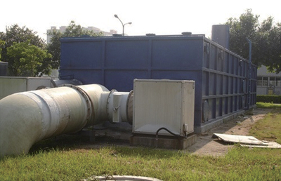 各臭气源点的臭气经集气系统负压收集后,通过离心风机抽送,导入洗涤--生物滤床过滤联合除臭设备。前级洗涤床能有效除尘、调节臭气的温湿度、消减峰值浓度等冲击,去除部分水溶性物质。在多级生物过滤床内,通过气液、液固传质由多种微生物将致臭物质降解。